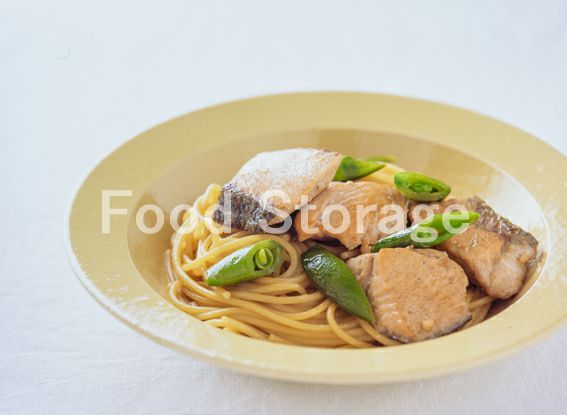 | 焼き鮭とスナップえんどうのバターじょうゆパスタ |