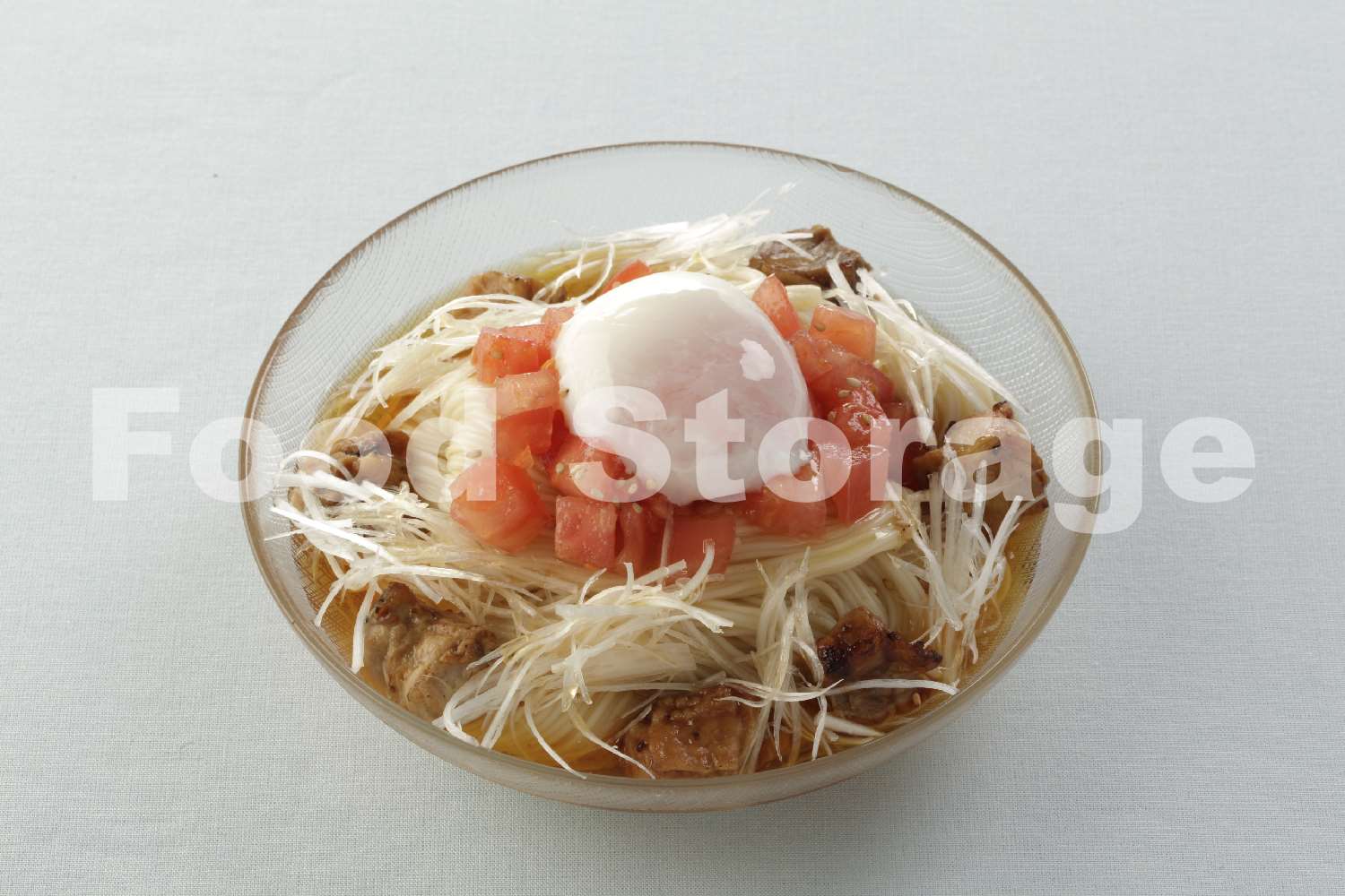| 【献立】焼き鶏とトマトの温玉のせそうめん+しらすやっこ |
