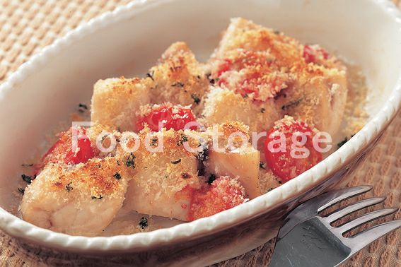 | コロコロかじきとプチトマトのチーズパン粉焼き |
