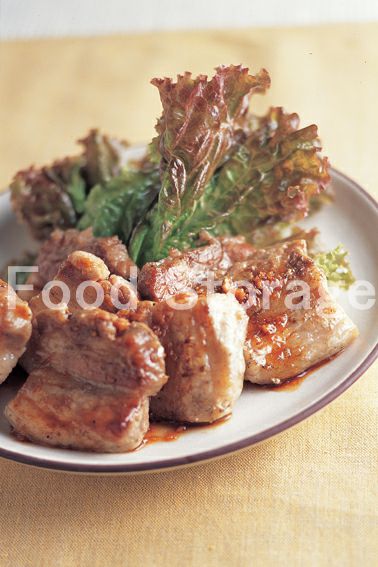 | 網焼き豚バラ肉のピリ辛だれがけ |